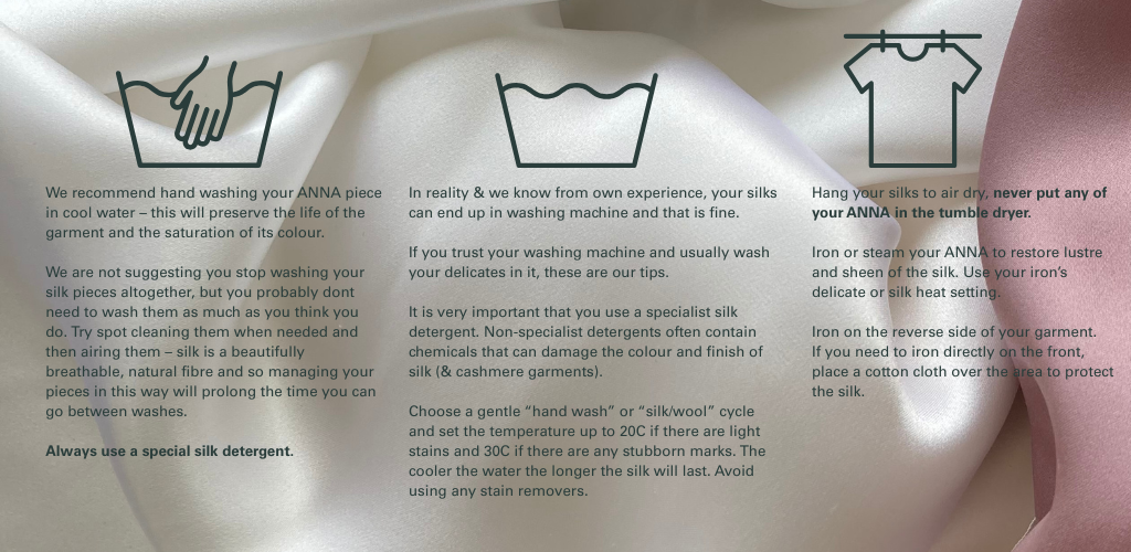 The natural fibres in silk have excellent properties that will prolong the time you can wear it without washing – silk is moisture-wicking and anti-bacterial. Our garments are hand made to the highest possible standard with focus on every detail.